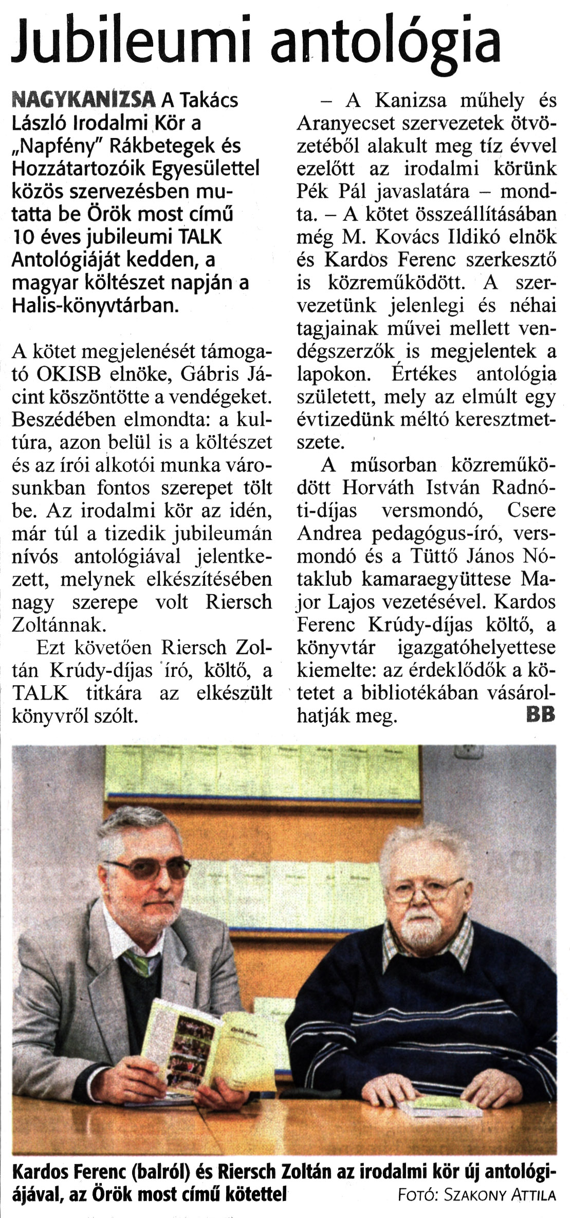 Nyilvános 1185 | 1432 | Zalai Hírlap 2023. április 13. 85. szám 2. oldal | Jubileumi antológia NAGYKANIZSA A Takács László Irodalmi Kör a „Napfény" Rákbetegek és Hozzátartozóik Egyesülettel közös szervezésben mutatta be Örök most című 10 éves jubileumi TALK Antológiáját kedden, a magyar költészet napján a Halis-könyvtárban. A kötet megjelenését támogató OKISB elnöke, Gábris Jácint köszöntötte a vendégeket. Beszédében elmondta: a kultúra, azon belül is a költészet és az írói alkotói munka városunkban fontos szerepet tölt be. Az irodalmi kör az idén, már túl a tizedik jubileumán nívós antológiával jelentkezett, melynek elkészítésében nagy szerepe volt Riersch Zoltánnak. Ezt követően Riersch Zoltán Krúdy-díjas író, költő, a TALK titkára az elkészült könyvről szólt. - A Kanizsa műhely és Aranyecset szervezetek ötvözetéből alakult meg tíz évvel ezelőtt az irodalmi körünk Pék Pál javaslatára - mondta. - A kötet összeállításában még M. Kovács Ildikó elnök és Kardos Ferenc szerkesztő is közreműködött. A szervezetünk jelenlegi és néhai tagjainak művei mellett vendégszerzők is megjelentek a lapokon. Értékes antológia született, mely az elmúlt egy évtizedünk méltó keresztmetszete. A műsorban közreműködött Horváth István Radnóti-díjas versmondó, Csere Andrea pedagógus-író, versmondó és a Tüttő János Nótaklub kamaraegyüttese Major Lajos vezetésével. Kardos Ferenc Krúdy-díjas költő, a könyvtár igazgatóhelyettese kiemelte: az érdeklődők a kötetet a bibliotékában vásárolhatják meg. BB Kardos Ferenc (balról) és Riersch Zoltán az irodalmi kör új antológiájával, az Örök most című kötettel Fotó. Szakony Attila |