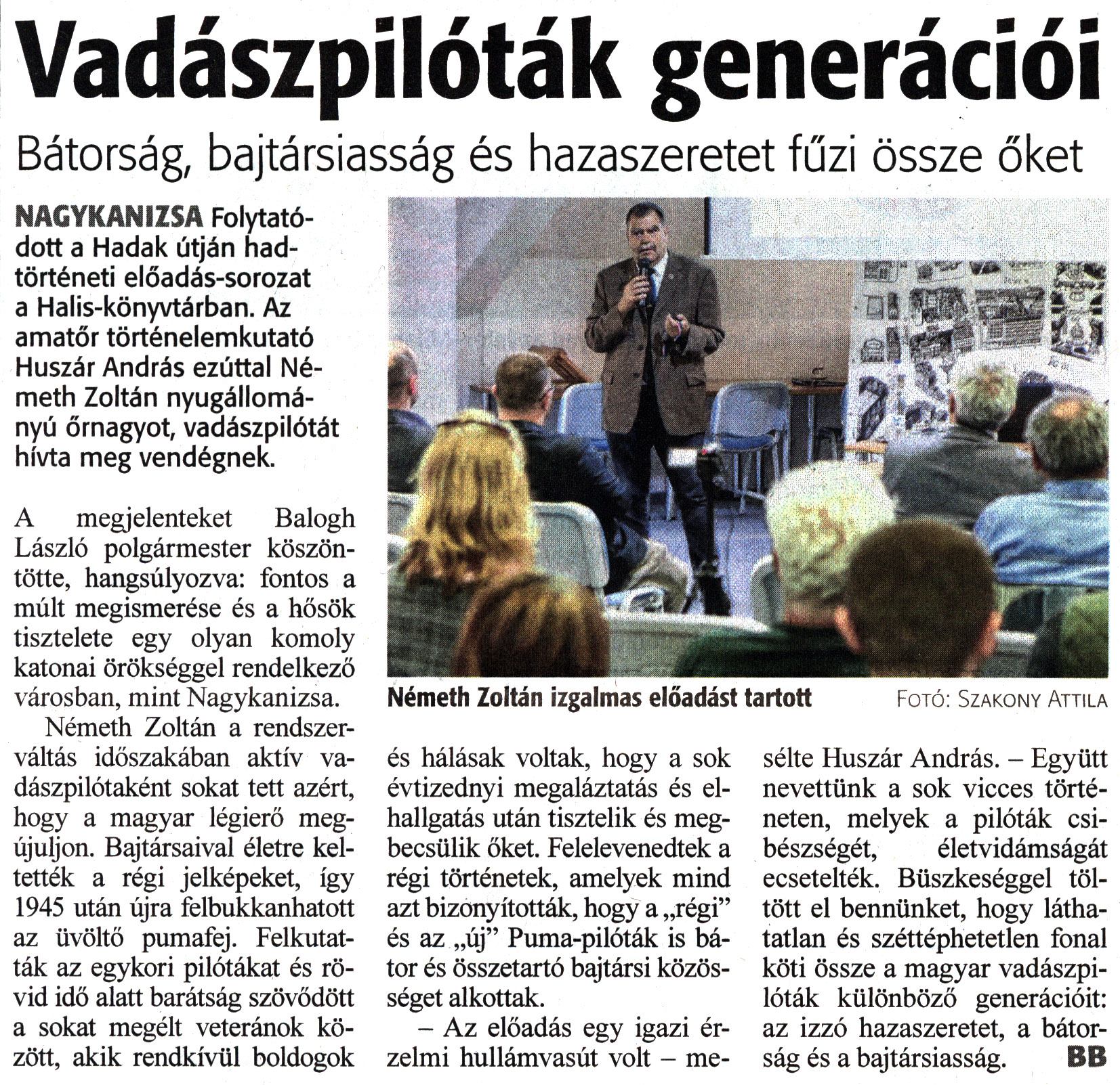 Nyilvános 1148 | 1380 | Zalai Hírlap 2023. május 12. 109. szám 16. oldal | Vadászpilóták generációi Bátorság, bajtársiasság és hazaszeretet fűzi össze őket NAGYKANIZSA Folytatódott a Hadak útján hadtörténeti előadás-sorozat a Halis-könyvtárban. Az amatőr történelemkutató Huszár András ezúttal Németh Zoltán nyugállományú őrnagyot, vadászpilótát hívta meg vendégnek. A megjelenteket Balogh László polgármester köszöntötte, hangsúlyozva: fontos a múlt megismerése és a hősök tisztelete egy olyan komoly katonai örökséggel rendelkező városban, mint Nagykanizsa. Németh Zoltán a rendszerváltás időszakában aktív vadászpilótaként sokat tett azért, hogy a magyar légierő megújuljon. Bajtársaival életre keltették a régi jelképeket, így 1945 után újra felbukkanhatott az üvöltő pumafej. Felkutatták az egykori pilótákat és rövid idő alatt barátság szövődött a sokat megélt veteránok között, akik rendkívül boldogok és hálásak voltak, hogy a sok évtizednyi megaláztatás és elhallgatás után tisztelik és megbecsülik őket. Felelevenedtek a régi történetek, amelyek mind azt bizonyították, hogy a „régi" és az „új" Puma-pilóták is bátor és összetartó bajtársi közösséget alkottak. - Az előadás egy igazi érzelmi hullámvasút volt - mesélte Huszár András. - Együtt nevettünk a sok vicces történeten, melyek a pilóták csi-bészségét, életvidámságát ecsetelték. Büszkeséggel töltött el bennünket, hogy láthatatlan és széttéphetetlen fonal köti össze a magyar vadászpilóták különböző generációit: az izzó hazaszeretet, a bátorság és a bajtársiasság. BB Németh Zoltán izgalmas előadást tartott Fotó: Szakony Attila |