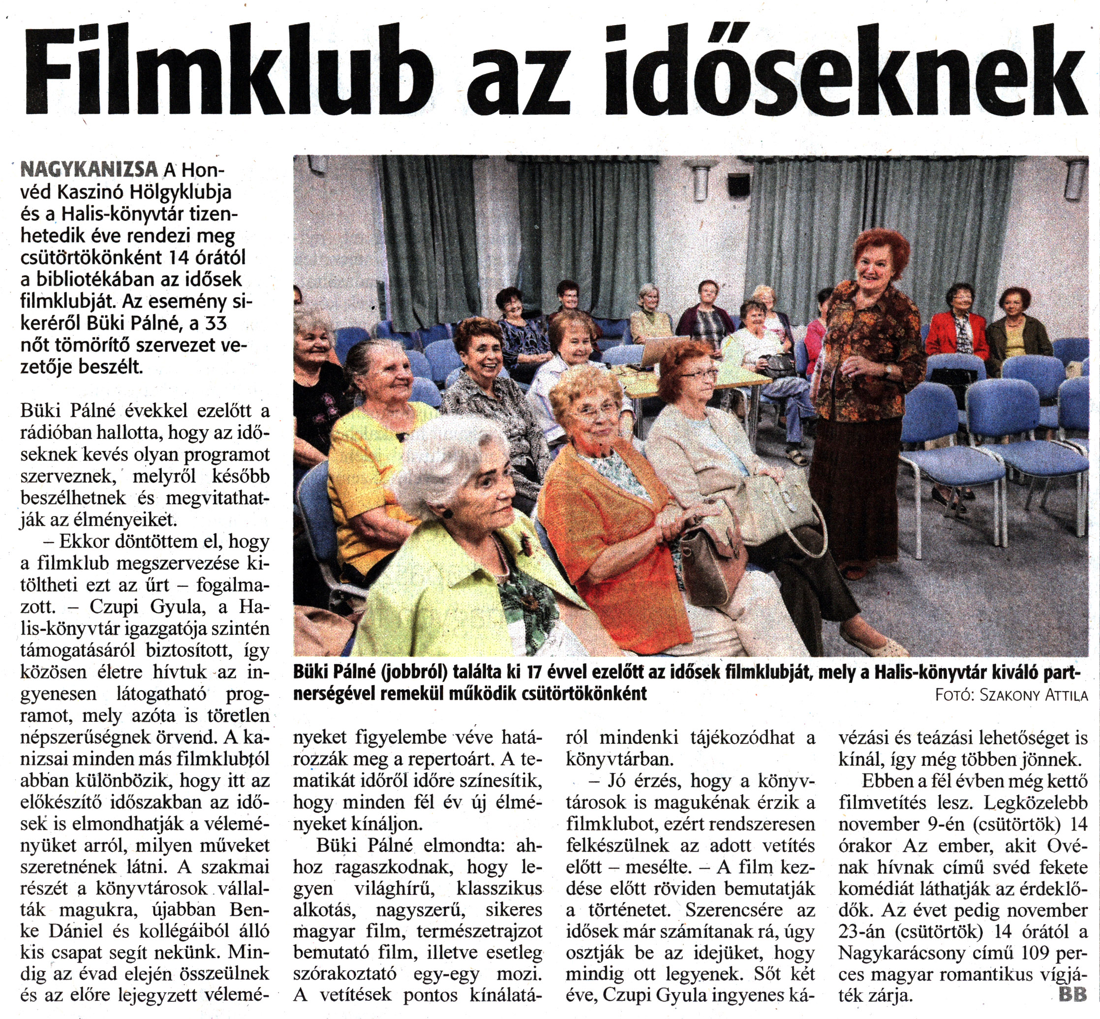 Nyilvános 1179 | 1457 | Zalai Hírlap 2023. november 2. 255. szám 6. oldal | Filmklub az időseknek NAGYKANIZSA A Honvéd Kaszinó Hölgyklubja és a Halis-könyvtár tizenhetedik éve rendezi meg csütörtökönként 14 órától a bibliotékában az idősek filmklubját. Az esemény sikeréről Büki Pálné, a 33 nőt tömörítő szervezet vezetője beszélt. Büki Pálné (jobbról) találta ki 17 évvel ezelőtt az idősek filmklubját, mely a Halis-könyvtár kiváló partnerségével remekül működik csütörtökönként Fotó: Szakony Attila Büki Pálné évekkel ezelőtt a rádióban hallotta, hogy az időseknek kevés olyan programot szerveznek, melyről később beszélhetnek és megvitathatják az élményeikét. - Ekkor döntöttem el, hogy a filmklub megszervezése kitöltheti ezt az űrt - fogalmazott. - Czupi Gyula, a Halis-könyvtár igazgatója szintén támogatásáról biztosított, így közösen életre hívtuk az ingyenesen látogatható programot, mely azóta is töretlen népszerűségnek örvend. A kanizsai minden más filmklubtól abban különbözik, hogy itt az előkészítő időszakban az idősek is elmondhatják a véleményüket arról, milyen műveket szeretnének látni. A szakmai részét a könyvtárosok vállalták magukra, újabban Benke Dániel és kollégáiból álló kis csapat segít nekünk. Mindig az évad elején összeülnek és az előre lejegyzett véleményeket figyelembe véve határozzák meg a repertoárt. A tematikát időről időre színesítik, hogy minden fél év új élményeket kínáljon. Büki Pálné elmondta: ahhoz ragaszkodnak, hogy legyen világhírű, klasszikus alkotás, nagyszerű, sikeres magyar film, természetrajzot bemutató film, illetve esetleg szórakoztató egy-egy mozi. A vetítések pontos kínálatáról mindenki tájékozódhat a könyvtárban. - Jó érzés, hogy a könyvtárosok is magukénak érzik a filmklubot, ezért rendszeresen felkészülnek az adott vetítés előtt - mesélte. - A film kezdése előtt röviden bemutatják a történetet. Szerencsére az idősek már számítanak rá, úgy osztják be az idejüket, hogy mindig ott legyenek. Sőt két éve, Czupi Gyula ingyenes kávézási és teázási lehetőséget is kínál, így még többen jönnek. Ebben a fél évben még kettő filmvetítés lesz. Legközelebb november 9-én (csütörtök) 14 órakor Az ember, akit Ové-nak hívnak című svéd fekete komédiát láthatják az érdeklődők. Az évet pedig november 23-án (csütörtök) 14 órától a Nagykarácsony című 109 perces magyar romantikus vígjáték zárja. BB |