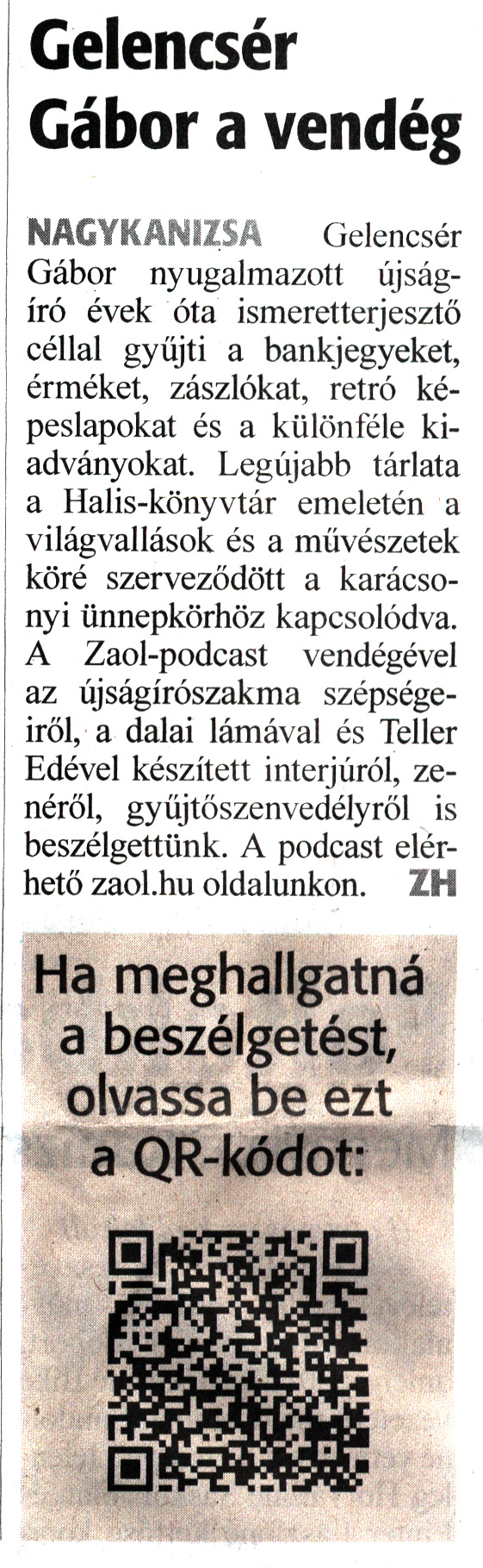 Nyilvános 1140 | 1402 | Zalai Hírlap 2023. december 13. 290. szám 1. oldal | Gelencsér Gábor a vendég NAGYKANIZSA Gelencsér Gábor nyugalmazott újságíró évek óta ismeretterjesztő céllal gyűjti a bankjegyeket, érméket, zászlókat, retró képeslapokat és a különféle kiadványokat. Legújabb tárlata a Halis-könyvtár emeletén a világvallások és a művészetek köré szerveződött a karácsonyi ünnepkörhöz kapcsolódva. A Zaol-podcast vendégével az újságírószakma szépségeiről, a dalai lámával és Teller Edével készített interjúról, zenéről, gyűjtőszenvedélyről is beszélgettünk. A podcast elérhető zaol.hu oldalunkon. ZH Ha meghallgatná a beszélgetést, olvassa be ezt a QR-kódot: |