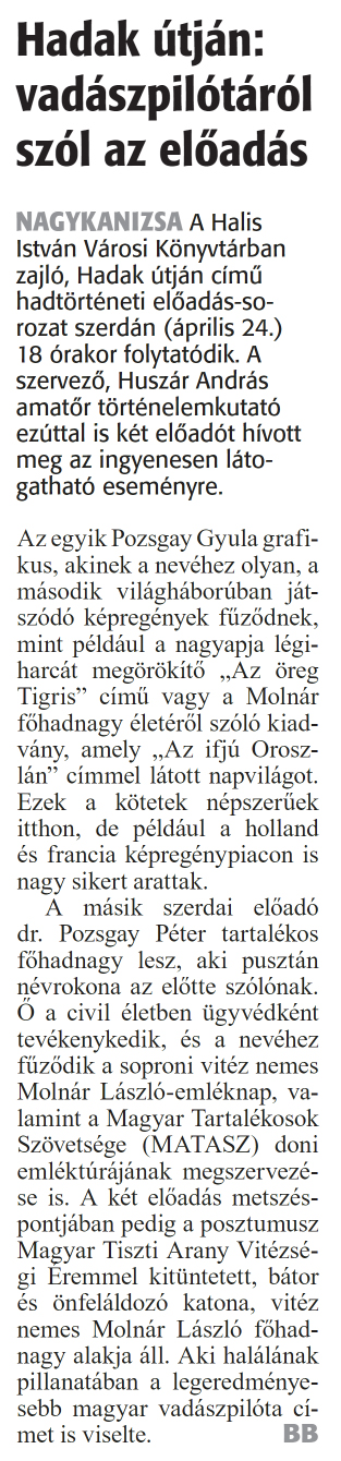 Nyilvános 1077 | 1595 | Zalai Hírlap 2024 április 24. 94. szám 2. oldal | Hadak útján: vadászpilótáról szól az előadás NAGYKANIZSA A Halis István Városi Könyvtárban zajló, Hadak útján című hadtörténeti előadás-sorozat szerdán (április 24.) 18 órakor folytatódik. A szervező, Huszár András amatőr történelemkutató ezúttal is két előadót hívott meg az ingyenesen látogatható eseményre. Az egyik Pozsgay Gyula grafikus, akinek a nevéhez olyan, a második világháborúban játszódó képregények fűződnek, mint például a nagyapja légiharcát megörökítő „Az öreg Tigris" című vagy a Molnár főhadnagy életéről szóló kiadvány, amely „Az ifjú Oroszlán" címmel látott napvilágot. Ezek a kötetek népszerűek itthon, de például a holland és francia képregénypiacon is nagy sikert arattak. A másik szerdai előadó dr. Pozsgay Péter tartalékos főhadnagy lesz, aki pusztán névrokona az előtte szólónak. Ő a civil életben ügyvédként tevékenykedik, és a nevéhez fűződik a soproni vitéz nemes Molnár László-emléknap, valamint a Magyar Tartalékosok Szövetsége (MATASZ) doni emléktúrájának megszervezése is. A két előadás metszéspontjában pedig a posztumusz Magyar Tiszti Arany Vitézségi Eremmel kitüntetett, bátor és önfeláldozó katona, vitéz nemes Molnár László főhadnagy alakja áll. Aki halálának pillanatában a legeredményesebb magyar vadászpilóta címet is viselte. BB |