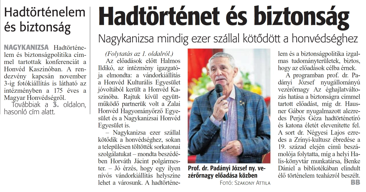Nyilvános 1031 | 1192 | Zalai Hírlap 2024. október 24. 248. szám 1, 3. oldal | Hadtörténelem és biztonság NAGYKANIZSA Hadtörténelem és biztonságpolitika címmel tartottak konferenciát a Honvéd Kaszinóban. A rendezvény kapcsán november 3-ig fotókiállítás is látható az intézményben a 175 éves a Magyar Honvédségről. Továbbiak a 3. oldalon, hasonló cím alatt Hadtörténet és biztonság Nagykanizsa mindig ezer szállal kötődött a honvédséghez (Folytatás az 1. oldalról.) Az előadások előtt Halmos Ildikó, az intézmény igazgatója elmondta: a vándorkiállítás a Honvéd Kulturális Egyesület jóvoltából került a Honvéd Kaszinóba. Rajtuk kívül együttműködő partnerük volt a Zalai Honvéd Hagyományőrző Egyesület és a Nagykanizsai Honvéd Egyesület is. - Nagykanizsa ezer szállal kötődik a honvédséghez, sokan a településen töltötték sorkatonai szolgálatukat - mondta beszédében Horváth Jácint polgármester. - Jó érzés, hogy egy ilyen nívós vándorkiállítás helyszíne lehet a városunk. A hadtörténelem és a biztonságpolitika izgalmas tudományterületek, biztos, hogy az előadások célba érnek. A programban prof. dr. Padányi József nyugállományú vezérőrnagy Az éghajlatváltozás hatása a biztonságra címmel tartott előadást, míg dr. Hausner Gábor nyugalmazott alezredes Perjés Géza hadtörténetíró és katona életét elevenítette fel. A sort dr. Négyesi Lajos ezredes a Zrínyi-kultusz ébredése a 19. század elején című beszámolója folytatta, míg a helyi Halis-könyvtár munkatársa, Benke Dániel a bibliotékában elindult élő történelem teaházról beszélt. BB Prof. dr. Padányi József ny. vezérőrnagy előadása közben Fotó: Szakony Attila |