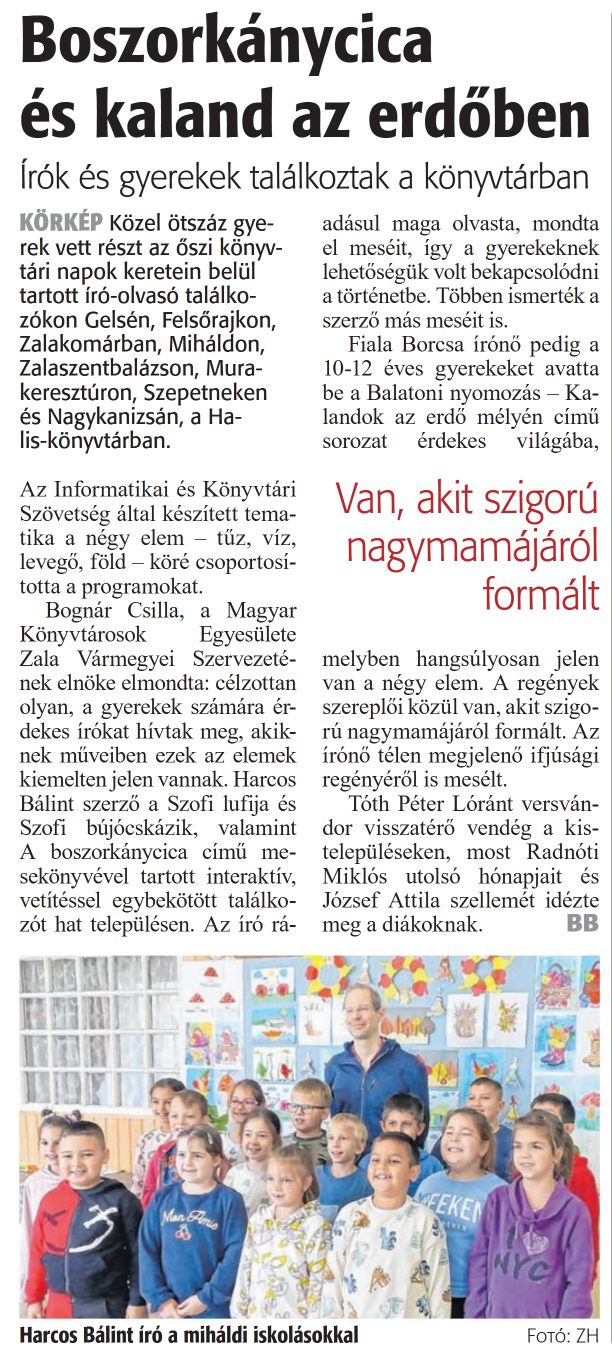 Nyilvános 971 | 1152 | Zalai Hírlap 2024. október 31. 254. szám 6. oldal | Boszorkánycica és kaland az erdőben írók és gyerekek találkoztak a könyvtárban KÖRKÉP Közel ötszáz gyerek vett részt az őszi könyvtári napok keretein belül tartott író-olvasó találkozókon Gelsén, Felsőrajkon, Zalakomárban, Miháldon, Zalaszentbalázson, Murakeresztúron, Szepetneken és Nagykanizsán, a Halis-könyvtárban. Az Informatikai és Könyvtári Szövetség által készített tematika a négy elem - tüz, víz, levegő, föld - köré csoportosította a programokat. Bognár Csilla, a Magyar Könyvtárosok Egyesülete Zala Vármegyei Szervezetének elnöke elmondta: célzottan olyan, a gyerekek számára érdekes írókat hívtak meg, akiknek műveiben ezek az elemek kiemelten jelen vannak. Harcos Bálint szerző a Szofi lufija és Szofi bújócskázik, valamint A boszorkánycica című mesekönyvével tartott interaktív, vetítéssel egybekötött találkozót hat településen. Az író rá- adásul maga olvasta, mondta el meséit, így a gyerekeknek lehetőségük volt bekapcsolódni a történetbe. Többen ismerték a szerző más meséit is. Fiala Borcsa írónő pedig a 10-12 éves gyerekeket avatta be a Balatoni nyomozás - Kalandok az erdő mélyén című sorozat érdekes világába, melyben hangsúlyosan jelen van a négy elem. A regények szereplői közül van, akit szigorú nagymamájáról formált. Az írónő télen megjelenő ifjúsági regényéről is mesélt. Tóth Péter Lóránt versvándor visszatérő vendég a kistelepüléseken, most Radnóti Miklós utolsó hónapjait és József Attila szellemét idézte meg a diákoknak. BB Harcos Bálint író a miháldi iskolásokkal Fotó: ZH |
