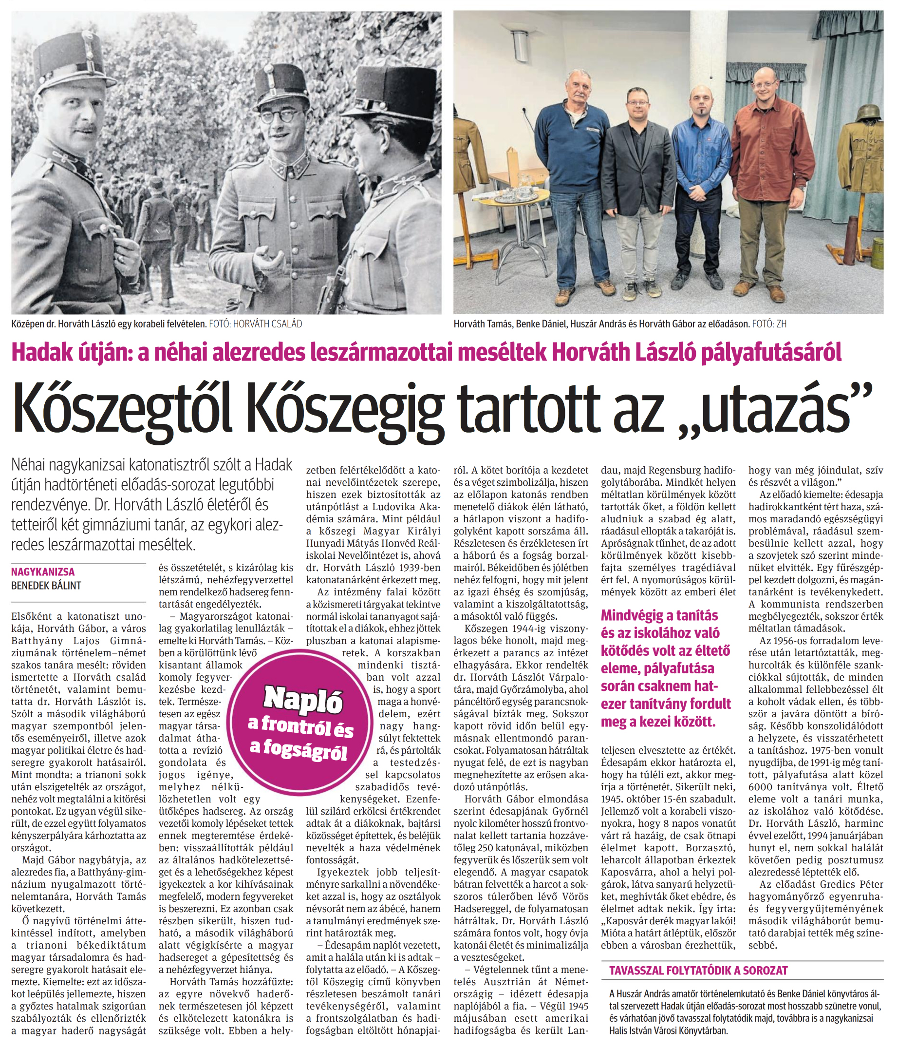 Nyilvános 1036 | 1315 | Zalai Hírlap 2024. december 10. 287. szám 6. oldal | Hadak útján: a néhai alezredes leszármazottai meséltek Horváth László pályafutásáról Kőszegtől Kőszegig tartott az „utazás" Néhai nagykanizsai katonatisztről szólt a Hadak útján hadtörténeti előadás-sorozat legutóbbi rendezvénye. Dr. Horváth László életéről és tetteiről két gimnáziumi tanár, az egykori alezredes leszármazottai meséltek. NAGYKANIZSA BENEDEK BÁLINT Elsőként a katonatiszt unokája, Horváth Gábor, a város Batthyány Lajos Gimnáziumának történelem-német szakos tanára mesélt: röviden ismertette a Horváth család történetét, valamint bemutatta dr. Horváth Lászlót is. Szólt a második világháború magyar szempontból jelentős eseményeiről, illetve azok magyar politikai életre és hadseregre gyakorolt hatásairól. Mint mondta: a trianoni sokk után elszigetelték az országot, nehéz volt megtalálni a kitörési pontokat. Ez ugyan végül sikerült, de ezzel együtt folyamatos kényszerpályára kárhoztatta az országot. Majd Gábor nagybátyja, az alezredes fia, a Batthyány-gimnázium nyugalmazott történelemtanára, Horváth Tamás következett. Ő nagyívű történelmi áttekintéssel indított, amelyben a trianoni békediktátum magyar társadalomra és hadseregre gyakorolt hatásait elemezte. Kiemelte: ezt az időszakot leépülés jellemezte, hiszen a győztes hatalmak szigorúan szabályozták és ellenőrizték a magyar haderő nagyságát és összetételét, s kizárólag kis létszámú, nehézfegyverzettel nem rendelkező hadsereg fenntartását engedélyezték. - Magyarországot katonailag gyakorlatilag lenullázták - emelte ki Horváth Tamás. - Közben a körülöttünk lévő kisantant államok komoly fegyverkezésbe kezdtek. Természetesen az egész magyar társadalmat áthatotta a revízió gondolata és jogos igénye, melyhez nélkülözhetetlen volt egy ütőképes hadsereg. Az ország vezetői komoly lépéseket tettek ennek megteremtése érdekében: visszaállították például az általános hadkötelezettséget és a lehetőségekhez képest igyekeztek a kor kihívásainak megfelelő, modern fegyvereket is beszerezni. Ez azonban csak részben sikerült, hiszen tudható, a második világháború alatt végigkísérte a magyar hadsereget a gépesítettség és a nehézfegyverzet hiánya. Horváth Tamás hozzáfűzte: az egyre növekvő haderőnek természetesen jól képzett és elkötelezett katonákra is szüksége volt. Ebben a helyzetben felértékelődött a katonai nevelőintézetek szerepe, hiszen ezek biztosították az utánpótlást a Ludovika Akadémia számára. Mint például a kőszegi Magyar Királyi Hunyadi Mátyás Honvéd Reáliskolai Nevelőintézet is, ahová dr. Horváth László 1939-ben katonatanárként érkezett meg. Az intézmény falai között a közismereti tárgyakat tekintve normál iskolai tananyagot sajátítottak el a diákok, ehhez jöttek pluszban a katonai alapismeretek. A korszakban mindenki tisztában volt azzal is, hogy a sport maga a honvédelem, ezért nagy hangsúlyt fektettek rá, és pártolták a testedzéssel kapcsolatos szabadidős tevékenységeket. Ezenfelül szilárd erkölcsi értékrendet adtak át a diákoknak, bajtársi közösséget építettek, és beléjük nevelték a haza védelmének fontosságát. Igyekeztek jobb teljesítményre sarkallni a növendékeket azzal is, hogy az osztályok névsorát nem az ábécé, hanem a tanulmányi eredmények szerint határozták meg. - Édesapám naplót vezetett, amit a halála után ki is adtak - folytatta az előadó. - A Kőszegtől Kőszegig című könyvben részletesen beszámolt tanári tevékenységéről, valamint a frontszolgálatban és hadifogságban eltöltött hónapjairól. A kötet borítója a kezdetet és a véget szimbolizálja, hiszen az előlapon katonás rendben menetelő diákok élén látható, a hátlapon viszont a hadifogolyként kapott sorszáma áll. Részletesen és érzékletesen írt a háború és a fogság borzalmairól. Békeidőben és jólétben nehéz felfogni, hogy mit jelent az igazi éhség és szomjúság, valamint a kiszolgáltatottság, a másoktól való függés. Kőszegen 1944-ig viszonylagos béke honolt, majd megérkezett a parancs az intézet elhagyására. Ekkor rendelték dr. Horváth Lászlót Várpalotára, majd Győrzámolyba, ahol páncéltörő egység parancsnokságával bízták meg. Sokszor kapott rövid időn belül egymásnak ellentmondó parancsokat. Folyamatosan hátráltak nyugat felé, de ezt is nagyban megnehezítette az erősen akadozó utánpótlás. Horváth Gábor elmondása szerint édesapjának Győrnél nyolc kilométer hosszú frontvonalat kellett tartania hozzávetőleg 250 katonával, miközben fegyverük és lőszerük sem volt elegendő. A magyar csapatok bátran felvették a harcot a sokszoros túlerőben lévő Vörös Hadsereggel, de folyamatosan hátráltak. Dr. Horváth László számára fontos volt, hogy óvja katonái életét és minimalizálja a veszteségeket. - Végtelennek tűnt a menetelés Ausztrián át Németországig - idézett édesapja naplójából a fia. - Végül 1945 májusában esett amerikai hadifogságba és került Landau, majd Regensburg hadifogolytáborába. Mindkét helyen méltatlan körülmények között tartották őket, a földön kellett aludniuk a szabad ég alatt, ráadásul ellopták a takaróját is. Apróságnak tűnhet, de az adott körülmények között kisebbfajta személyes tragédiával ért fel. A nyomorúságos körülmények között az emberi élet teljesen elvesztette az értékét. Édesapám ekkor határozta el, hogy ha túléli ezt, akkor megírja a történetét. Sikerült neki, 1945. október 15-én szabadult. Jellemző volt a korabeli viszonyokra, hogy 8 napos vonatút várt rá hazáig, de csak ötnapi élelmet kapott. Borzasztó, leharcolt állapotban érkeztek Kapos
