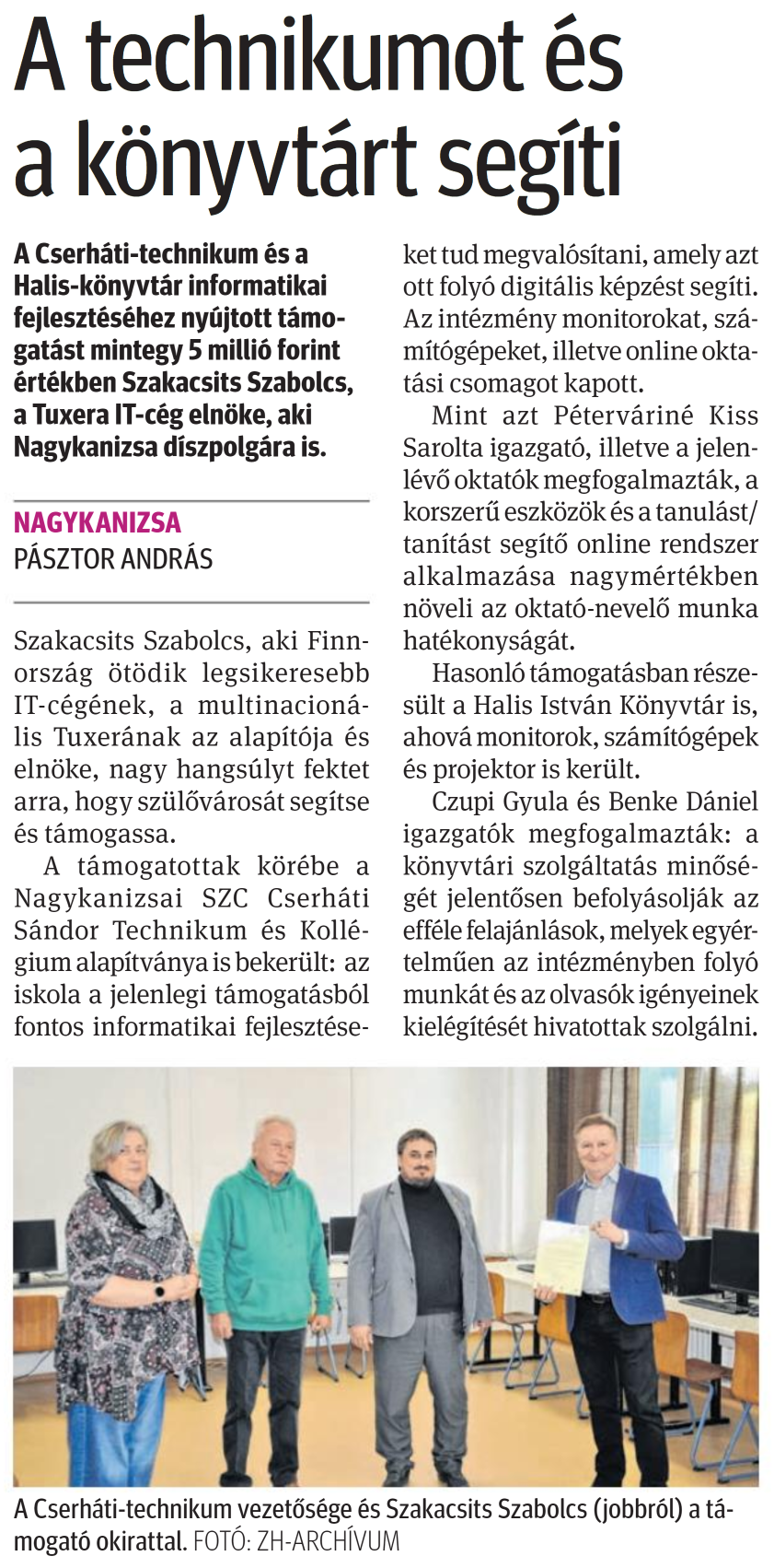 Nyilvános 1055 | 1420 | Zalai Hírlap 2024. december 18. 294. szám 5. oldal | A technikumot és a könyvtárt segíti A Cserháti-technikum és a Halis-könyvtár informatikai fejlesztéséhez nyújtott támogatást mintegy 5 millió forint értékben Szakacsits Szabolcs, a Tuxera IT-cég elnöke, aki Nagykanizsa díszpolgára is. NAGYKANIZSA PÁSZTOR ANDRÁS Szakacsits Szabolcs, aki Finnország ötödik legsikeresebb IT-cégének, a multinacionális Tuxerának az alapítója és elnöke, nagy hangsúlyt fektet arra, hogy szülővárosát segítse és támogassa. A támogatottak körébe a Nagykanizsai SZC Cserháti Sándor Technikum és Kollégium alapítványa is bekerült: az iskola a jelenlegi támogatásból fontos informatikai fejlesztéseket tud megvalósítani, amely azt ott folyó digitális képzést segíti. Az intézmény monitorokat, számítógépeket, illetve online oktatási csomagot kapott. Mint azt Péterváriné Kiss Sarolta igazgató, illetve a jelenlévő oktatók megfogalmazták, a korszerű eszközök és a tanulást/ tanítást segítő online rendszer alkalmazása nagymértékben növeli az oktató-nevelő munka hatékonyságát. Hasonló támogatásban részesült a Halis István Könyvtár is, ahová monitorok, számítógépek és projektor is került. Czupi Gyula és Benke Dániel igazgatók megfogalmazták: a könyvtári szolgáltatás minőségét jelentősen befolyásolják az efféle felajánlások, melyek egyértelműen az intézményben folyó munkát és az olvasók igényeinek kielégítését hivatottak szolgálni. A Cserháti-technikum vezetősége és Szakacsits Szabolcs (jobbról) a támogató okirattal. FOTÓ: ZH-ARCHÍVUM |