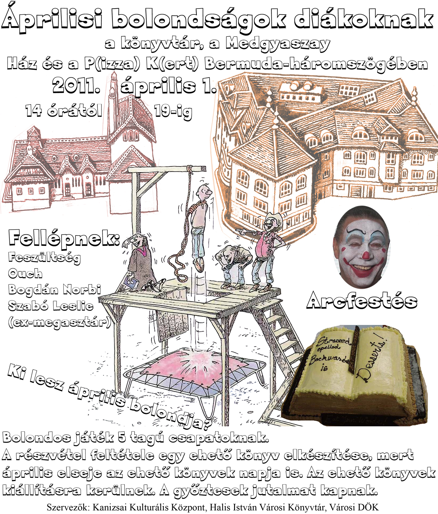 Nyilvános 1527 | 4013 | 2011. április 1. 14–19-ig | Áprilisi bolondságok diákoknak a könyvtár, a Medgyaszay Ház és a P(izza) K(ert) Bermuda-háromszögében Fellépnek: Feszültség, Ouch, Bogdán Norbi, Szabó Leslie (ex-megasztár) Lesz még: arcfestés Bolondos játék 5 tagú csapatoknak. A részvétel feltétele egy ehető könyv elkészítése, mert április elseje az ehető könyvek napja is. Az ehető könyvek kiállításra kerülnek. A győztesek jutalmat kapnak. Szervezők: Kanizsai Kulturális Központ, Halis István Városi Könyvtár, Városi DÖK |