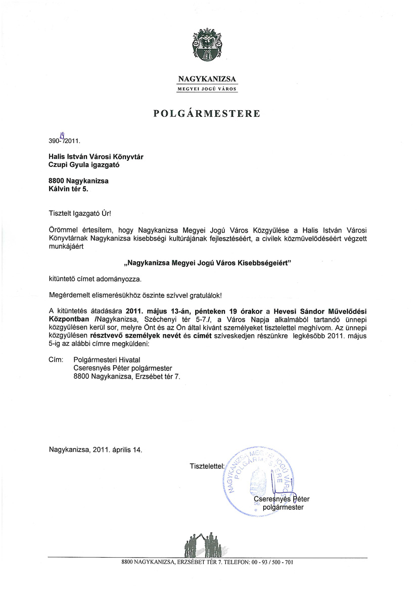 Nyilvános 1476 | 3349 | NAGYKANIZSA | MEGYEI JOGÚ VÁROS POLGÁRMESTERE 390-19/2011. Halis István Városi Könyvtár Czupi Gyula igazgató 8800 Nagykanizsa Kálvin tér 5. Tisztelt Igazgató Úr! Örömmel értesítem, hogy Nagykanizsa Megyei Jogú Város Közgyűlése a Halis István Városi Könyvtárnak Nagykanizsa kisebbségi kultúrájának fejlesztéséért, a civilek közművelődéséért végzett munkájáért „Nagykanizsa Megyei Jogú Város Kisebbségeiért” kitüntető címet adományozza. Megérdemelt elismerésükhöz őszinte szívvel gratulálok! A kitüntetés átadására 2011. május 13-án, pénteken 19 órakor a Hevesi Sándor Művelődési Központban /Nagykanizsa, Széchenyi tér 5-7./, a Város Napja alkalmából tartandó ünnepi közgyűlésen kerül sor, melyre Önt és az Ön által kívánt személyeket tisztelettel meghívom. Az ünnepi közgyűlésen résztvevő személyek nevét és címét szíveskedjen részünkre legkésőbb 2011. május 5-ig az alábbi címre megküldeni: Cím: Polgármesteri Hivatal Cseresnyés Péter polgármester 8800 Nagykanizsa, Erzsébet tér 7. Nagykanizsa, 2011. április 14. Tisztelettel: Cseresnyés Péter polgármester |