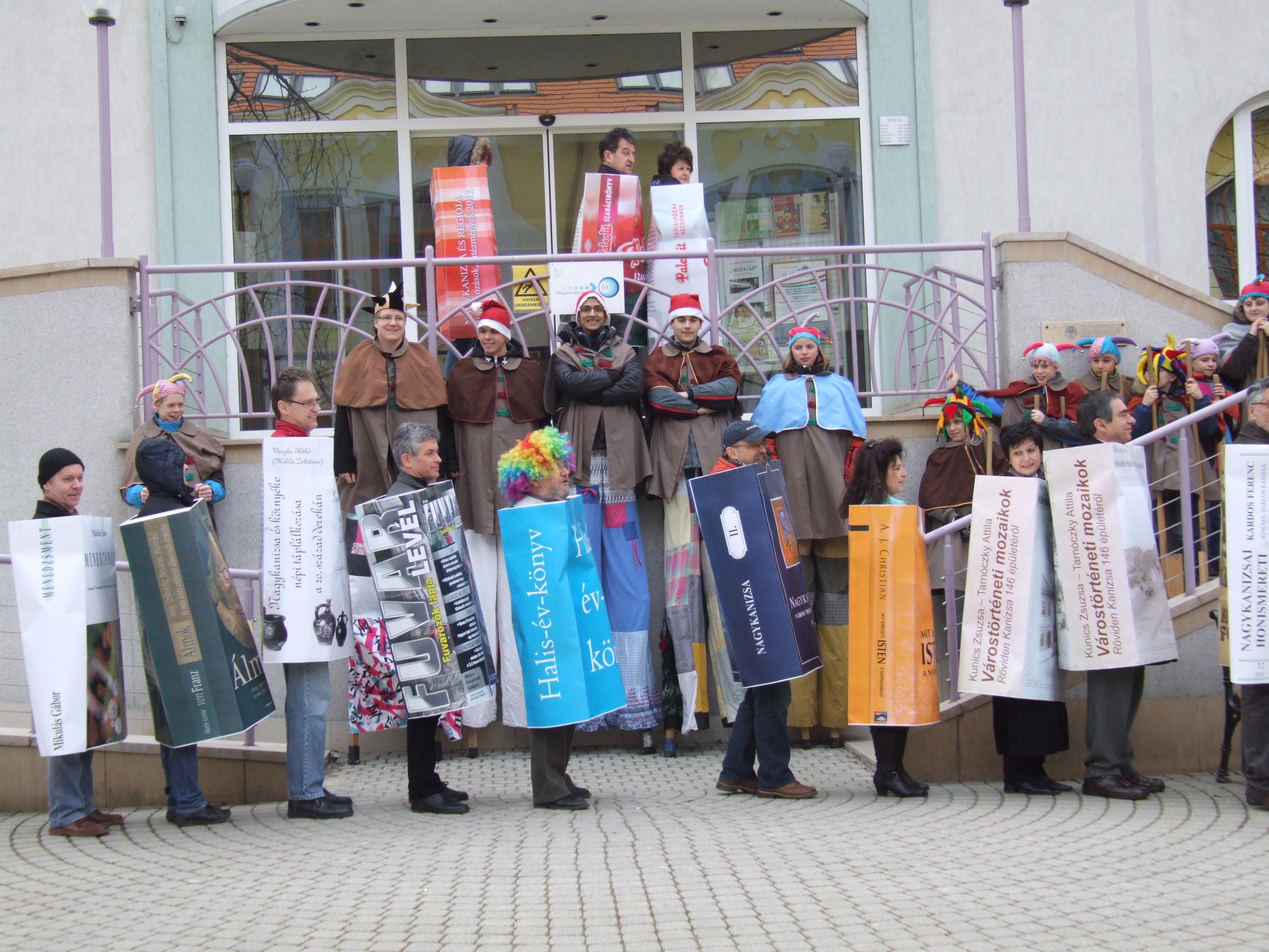 Nyilvános 1526 | 3170 | 2013. február 9. A farsangi fánkfesztiválra készülve felhívásban kértük olvasóinkat, hogy öltsék magukra kedves könyvüket. Egy „könyvespolcnyi” jelentkező vette magára kedves olvasmányát, az ő vonulásukról készültek ezek a képek. A környezetükben néhol láthatók a Nagykanizsai Gólyalábasok, akik szintén a könyvtárhoz kötődnek. A „felvonuló kötetek” a könyvtár épületében még megtekinthetők. | |