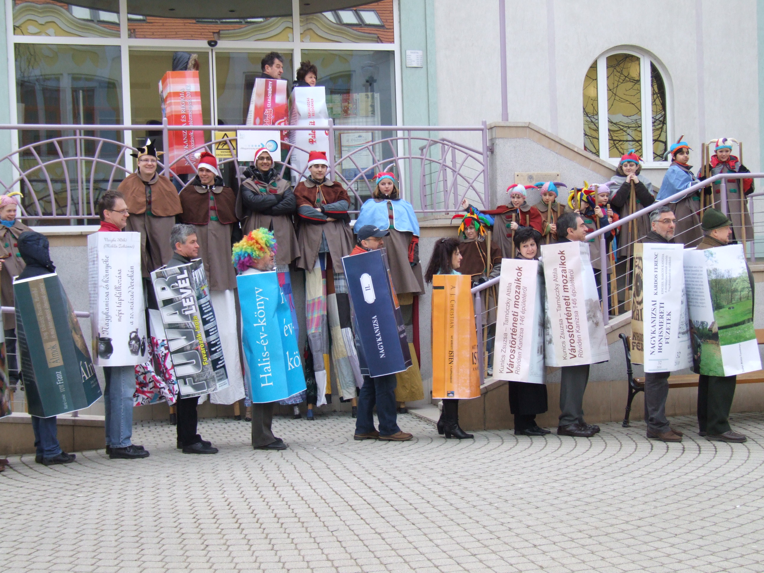 Nyilvános 1494 | 3064 | Rövid leírás | Teljes leírás (446 B) | 2013. február 9. A farsangi fánkfesztiválra készülve felhívásban kértük olvasóinkat, hogy öltsék magukra kedves könyvüket. Egy „könyvespolcnyi” jelentkező vette magára kedves olvasmányát, az ő vonulásukról készültek ezek a képek. A környezetükben néhol láthatók a Nagykanizsai Gólyalábasok, akik szintén a könyvtárhoz kötődnek. A „felvonuló kötetek” a könyvtár épületében még megtekinthetők. |