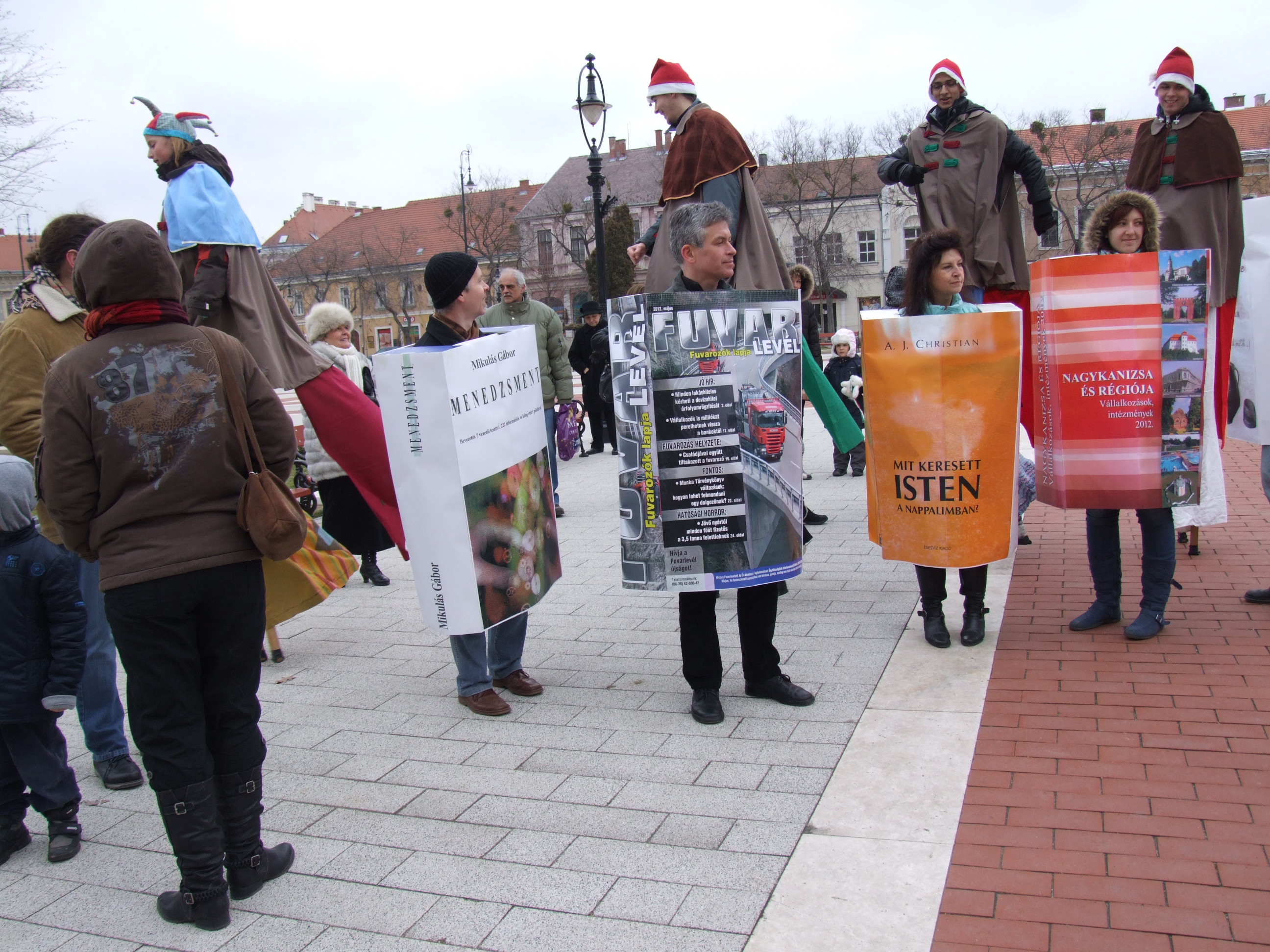 Nyilvános 1138 | 1468 | 2013. február 9. A farsangi fánkfesztiválra készülve felhívásban kértük olvasóinkat, hogy öltsék magukra kedves könyvüket. Egy „könyvespolcnyi” jelentkező vette magára kedves olvasmányát, az ő vonulásukról készültek ezek a képek. A környezetükben néhol láthatók a Nagykanizsai Gólyalábasok, akik szintén a könyvtárhoz kötődnek. A „felvonuló kötetek” a könyvtár épületében még megtekinthetők. | |