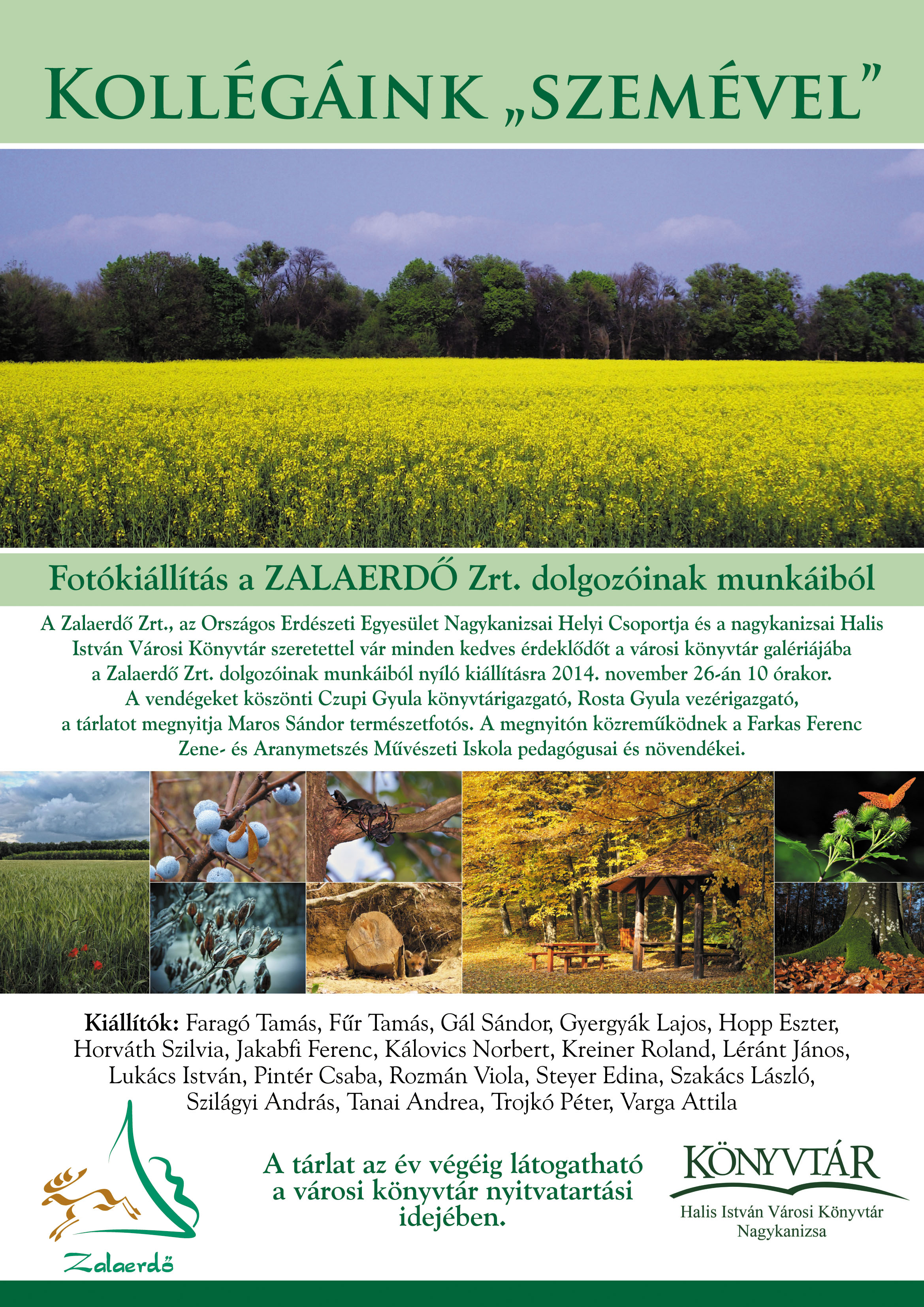 Nyilvános 1635 | 3102 | Kollégáink szemével | Fotókiállítás a ZALAERDŐ Zrt. dolgozóinak munkáiból A Zalaerdő Zrt., az Országos Erdészeti Egyesület Nagykanizsai Helyi Csoportja és a nagykanizsai Halis István Városi Könyvtár szeretettel vár minden kedves érdeklődőt a városi könyvtár galériájába a Zalaerdő Zrt. dolgozóinak munkáiból nyíló kiállításra 2014. november 26-án 10 órakor. A vendégeket köszönti Czupi Gyula könyvtárigazgató, Rosta Gyula vezérigazgató, a tárlatot megnyitja Maros Sándor természetfotós. A megnyitón közreműködnek a Farkas Ferenc Zene- és Aranymetszés Művészeti Iskola pedagógusai és növendékei. Kiállítók: Faragó Tamás, Fűr Tamás, Gál Sándor, Gyergyák Lajos, Hopp Eszter, Horváth Szilvia, Jakabfi Ferenc, Kálovics Norbert, Kreiner Roland, Léránt János, Lukács István, Pintér Csaba, Rozmán Viola, Steyer Edina, Szakács László, Szilágyi András, Tanai Andrea, Trojkó Péter, Varga Attila A tárlat az év végéig látogatható a városi könyvtár nyitvatartási idejében. |