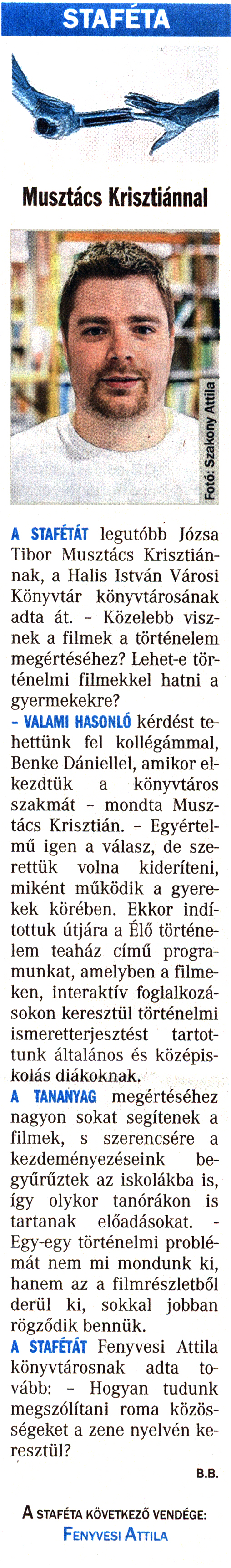 Nyilvános 1956 | 4794 | Vasárnapi Zalai Hírlap 2017. május 27. 21. szám 5. oldal | STAFÉTA Musztács Krisztiánnal A STAFÉTÁT legutóbb Józsa Tibor Musztács Krisztiánnak, a Halis István Városi Könyvtár könyvtárosának adta át. - Közelebb visznek a filmek a történelem megértéséhez? Lehet-e történelmi filmekkel hatni a gyermekekre? - VALAMI HASONLÓ kérdést tehettünk fel kollégámmal, Benke Dániellel, amikor elkezdtük a könyvtáros szakmát - mondta Musztács Krisztián. - Egyértelmű igen a válasz, de szerettük volna kideríteni, miként működik a gyerekek körében. Ekkor indítottuk útjára a Élő történelem teaház című programunkat, amelyben a filmeken, interaktív foglalkozásokon keresztül történelmi ismeretterjesztést tartottunk általános és középiskolás diákoknak. A TANANYAG megértéséhez nagyon sokat segítenek a filmek, s szerencsére a kezdeményezéseink begyűrűztek az iskolákba is, így olykor tanórákon is tartanak előadásokat. - Egy-egy történelmi problémát nem mi mondunk ki, hanem az a filmrészletből derül ki, sokkal jobban rögződik bennük. A STAFÉTÁT Fenyvesi Attila könyvtárosnak adta tovább: - Hogyan tudunk megszólítani roma közösségeket a zene nyelvén keresztül? B.B. A STAFÉTA KÖVETKEZŐ VENDÉGE: Fenyvesi Attila |