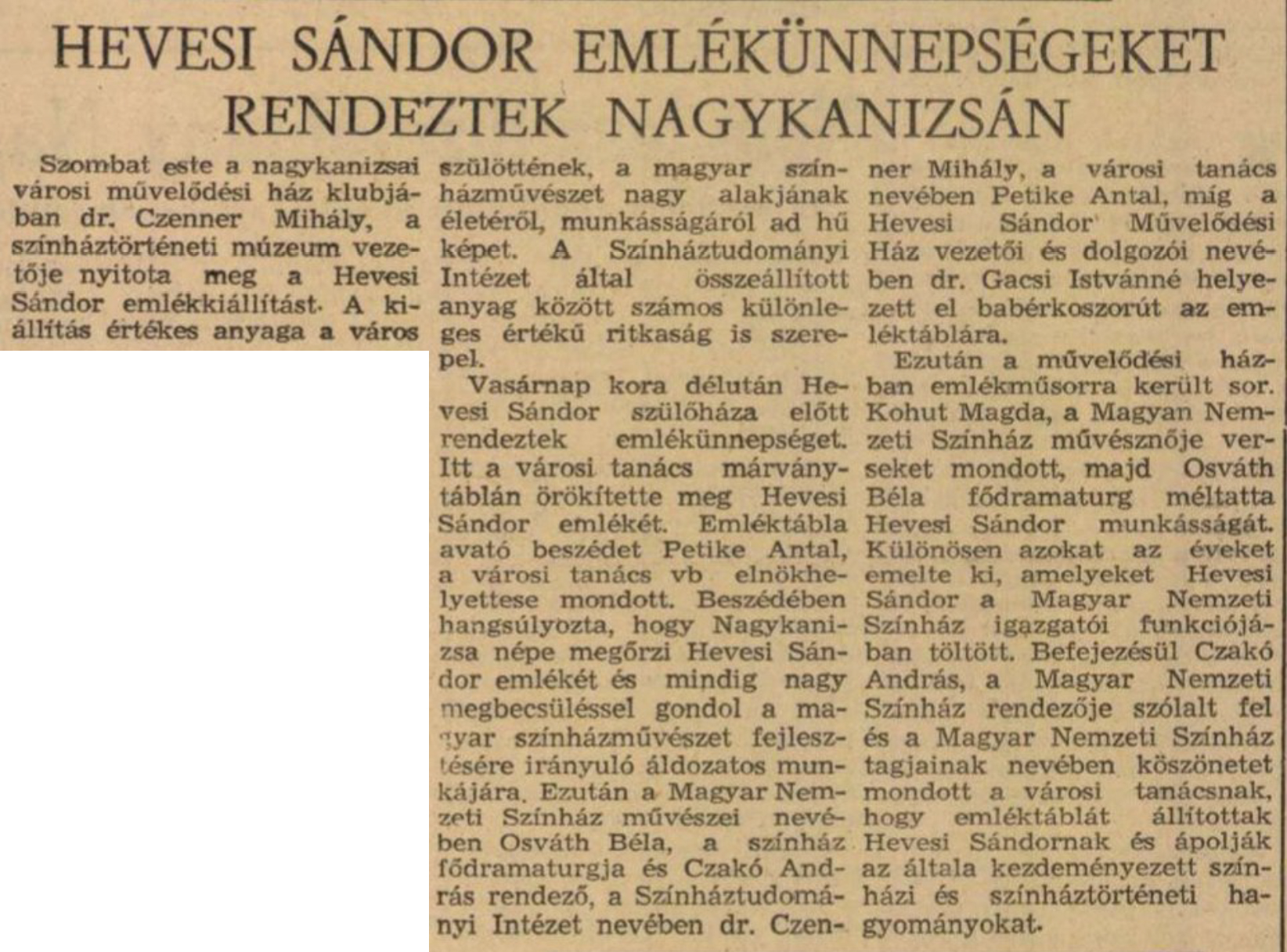 Nyilvános 1376 | 2308 | Zalai Hírlap 1964. december 15. 6. oldal | HEVESI SÁNDOR EMLÉKÜNNEPSÉGEKET RENDEZTEK NAGYKANIZSÁN Szombat este a nagykanizsai városi művelődési ház klubjában dr. Czenner Mihály, a színháztörténeti múzeum vezetője nyitotta meg a Hevesi Sándor emlékkiállítást - A kiállítás értékes anyaga a város szülöttének, a magyar színházművészet nagy alakjának életéről, munkásságáról ad hű képet. A Színháztudományi Intézet által összeállított anyag között számos különleges értékű ritkaság is szerepel. Vasárnap kora délután Hevesi Sándor szülőháza előtt rendeztek emlékünnepséget. Itt a városi tanács márványtáblán örökítette meg Hevesi Sándor emlékét. Emléktábla avató beszédet Petike Antal, a városi tanács vb elnökhelyettese mondott. Beszédében hangsúlyozta, hogy Nagykanizsa népe megőrzi Hevesi Sándor emlékét és mindig nagy megbecsüléssel gondol a magyar színházművészet fejlesztésére irányuló áldozatos munkájára. Ezután a Magyar Nemzeti Színház művészei nevében Osváth Béla, a színház fődramaturgja és Czakó András rendező, a Színháztudományi Intézet nevében dr. Czenner Mihály, a városi tanács nevében Petike Antal, míg a Hevesi Sándor Művelődési Ház vezetői és dolgozói nevében dr. Gacsi Istvánné helyezett el babérkoszorút az emléktáblára. Ezután a művelődési házban emlékműsorra került sor. Kohut Magda, a Magyan Nemzeti Színház művésznője verseket mondott, majd Osváth Béla fődramaturg méltatta Hevesi Sándor munkásságát. Különösen azokat az éveket emelte ki, amelyeket Hevesi Sándor a Magyar Nemzeti Színház igazgatói funkciójában töltött. Befejezésül Czakó András, a Magyar Nemzeti Színház rendezője szólalt fel és a Magyar Nemzeti Színház tagjainak nevében köszönetét mondott a városi tanácsnak, hogy emléktáblát állítottak Hevesi Sándornak és ápolják az általa kezdeményezett színházi és színháztörténeti hagyományokat. |