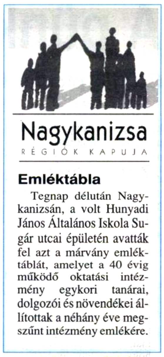 Nyilvános 1328 | 2293 | Rövid leírás | Teljes leírás (376 B) | Zalai Hírlap 2000. június 9. 5. oldal Emléktábla Tegnap délután Nagykanizsán, a volt Hunyadi János Általános Iskola Sugár utcai épületén avatták fel azt a márvány emléktáblát, amelyet a 40 évig működő oktatási intézmény egykori tanárai, dolgozói és növendékei állítottak a néhány éve megszűnt intézmény emlékére. |